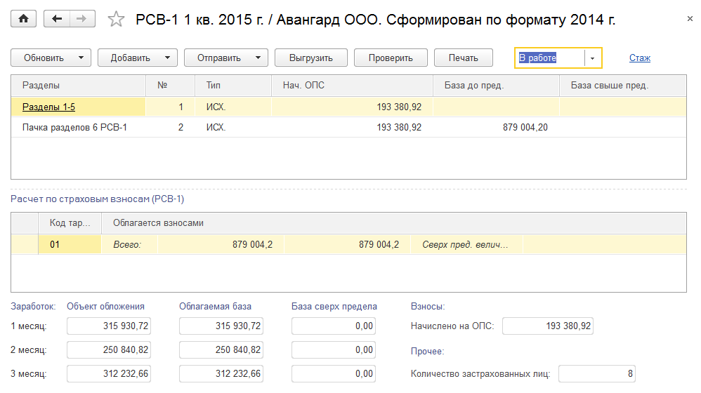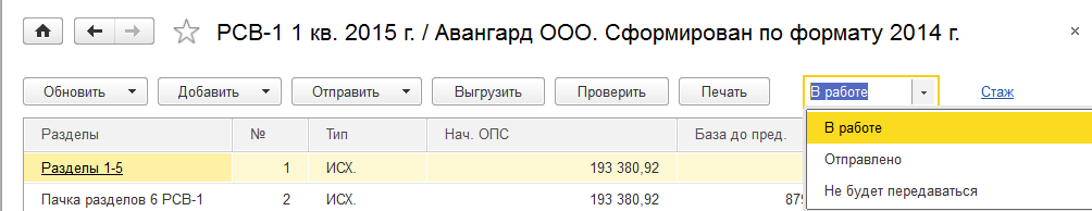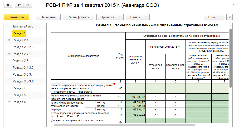 При нажатии ссылки "Разделы 1-5" открывается форма РСВ-1 (ее сводная часть).