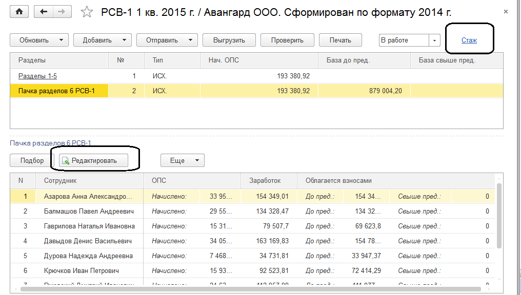 При необходимости можно отредактировать вручную как данные сотрудника по базе и взносам, так и периоды стажа.