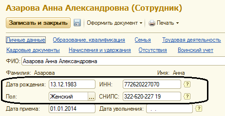 • Дата рождения – необходима для корректного расчета страховых взносов в Пенсионный Фонд, заполнения отчетности и т.д.