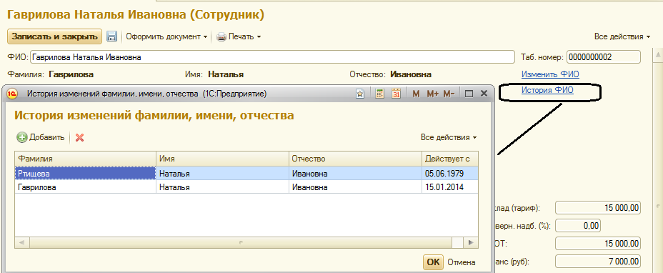 История изменения ФИО сотрудника можно просмотреть по ссылке "История ФИО".