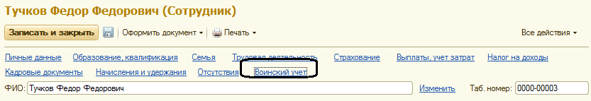 Данные военного билета для военнообязанных сотрудников вносятся по ссылке "Воинский учет".