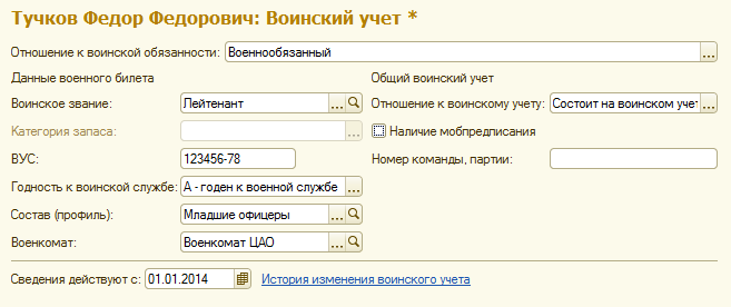 Тучков Ф.Ф. – военнообязанный, имеет военный билет: Военнообязанный, Лейтенант (Младшие офицеры), ВУС 123456-78,  годен к военной службе, данные по Военкомату ЦАО, Состоит на воинском учете на 01.01.2014.