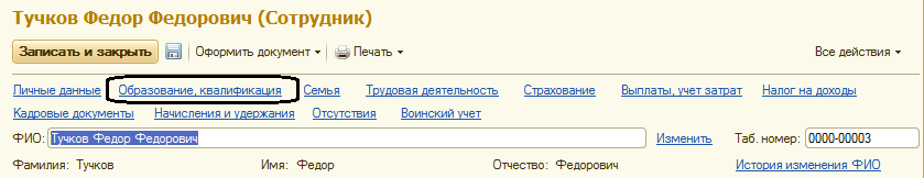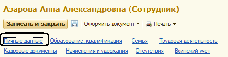 Для этого откроем карточку сотрудника, проверим уже имеющуюся информацию и корректность ее ввода