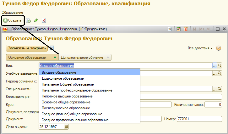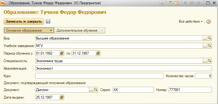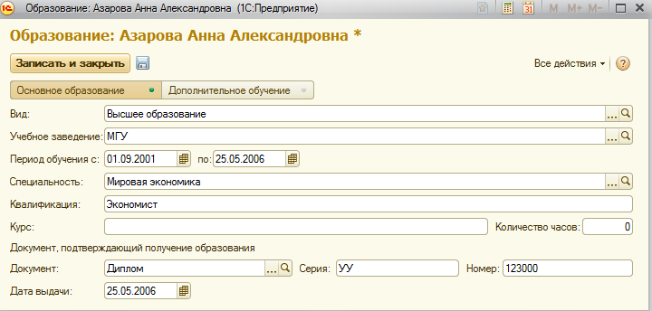 Такие сведения, как вид образования, специальность и т.п. вносятся выбором из классификатора.