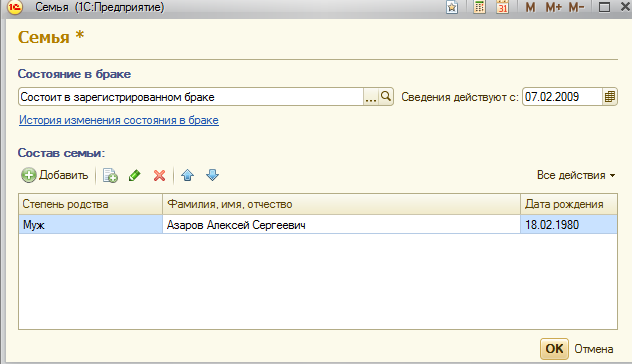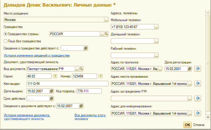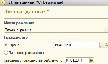 Персональная информация по человеку хранится в справочнике "Физические лица". Однако как уже отмечалось выше, эти данные можно вводить и через карточку сотрудника. Персональную информацию можно разделить на следующие группы: