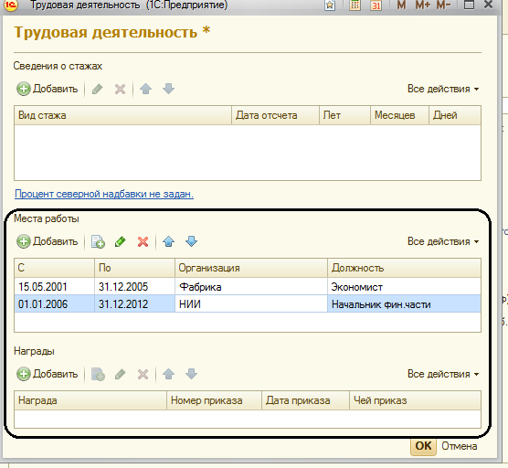 • процент надбавки, если у сотрудника он уже меняться не будет, либо  выслуженный северный стаж (если есть) до даты начала действия данной записи.