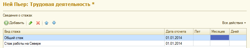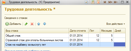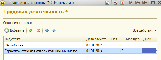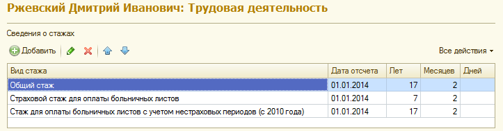 1. Внесем сведения о стажах для других сотрудников, необходимо заполнить общий и страховой стаж на момент приема на работу (01.01.2014):