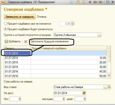 При этом укажем шкалу северной надбавки следующим образом: процент надбавки будет изменяться по группе 2 (обычная), укажем первую дату и нажмем команду "Заполнить будущие изменения". Запишем и сохраним данную информацию.