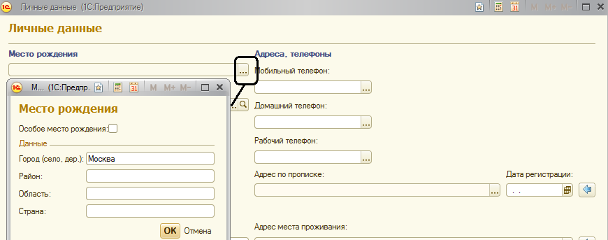 Контактные телефоны сотрудник не сообщил, заполним адрес регистрации (т.е. адрес по прописке). Ввод адреса осуществляется по адресному классификатору