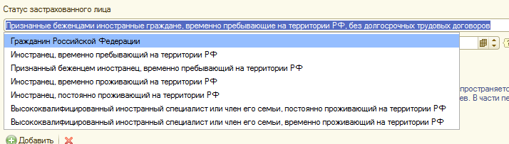 • Признанный беженцем иностранец, временно пребывающий на территории РФ – социальное страхование на таких сотрудников не распространяется, взносы в ПФР начисляются, если с сотрудником заключен трудовой договор на срок более 6-ти месяцев. Периоды заключения таких договоров указываются ниже отдельно;