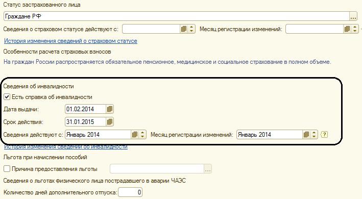 Сведения по инвалидности также вносятся по ссылке "Страхование". При внесении изменений в данные об инвалидности, необходимо указывать дату, с которой эти изменения актуальны, поскольку в конфигурации хранится история изменения инвалидности.