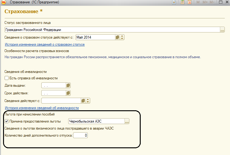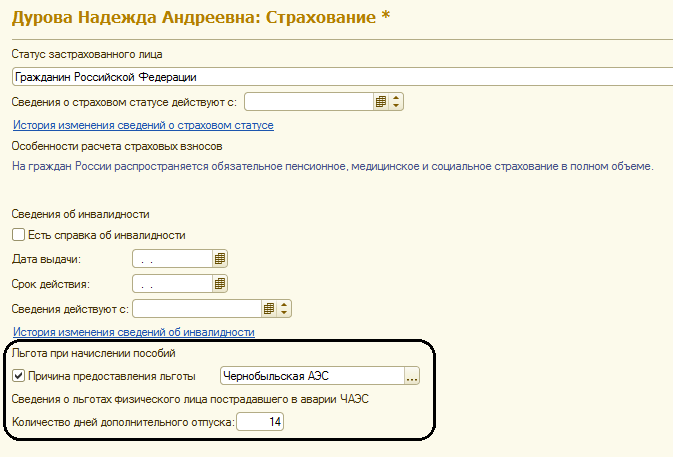 Если при расчете государственных пособий физическому лицу должна предоставляться льгота в связи с тем, что он подвергался радиации, то по ссылке "Страхование" в разделе "Льгота при начислении пособия" отмечается наличие льготы и ее основание.
