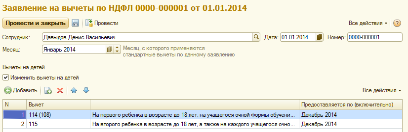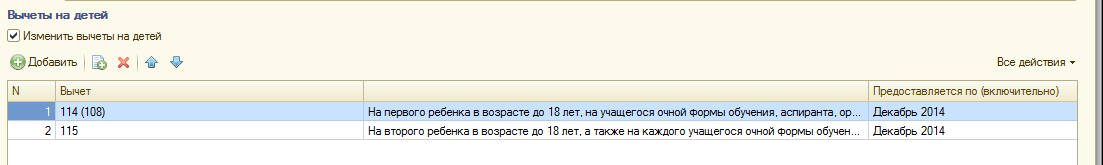 Если предоставляются вычеты на детей, то устанавливается соответствующий флаг, добавляются используемые коды вычетов и дата окончания предоставления вычета.