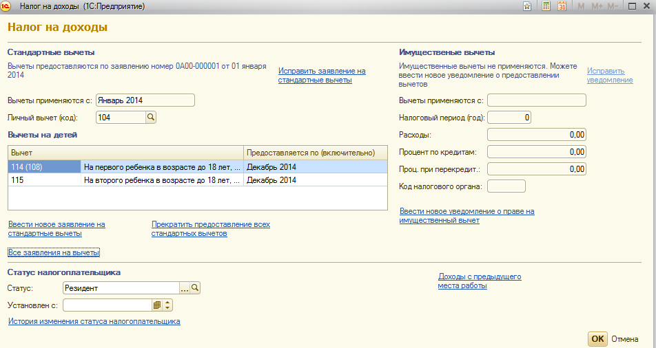 Откроем карточку сотрудника, перейдем по ссылке "Налог на доходы" и введем сведения о вычетах с 01.01.2014.