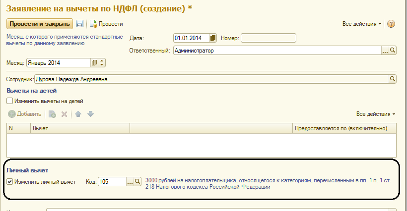 Если предоставляется личный вычет, то устанавливается соответствующий флаг и выбирается код вычета.