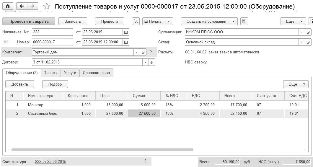 В организацию "ИНКОМ ПЛЮС" поступило оборудование от ООО "Торговый дом" по договору № 3 от 11.02.2015 года "Покупка ОС": монитор и системный блок. Договор в базу занесен ранее. Оборудование оплачено. Введен в эксплуатацию компьютер, который состоит из монитора и системного блока. Зарегистрируем накладную и счет-фактуру № 222 от 23.06.2015 года.