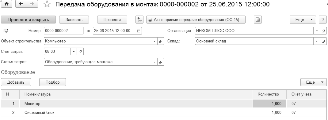 Создайте документ "Передача оборудования в монтаж" от 25.06.2015 года.