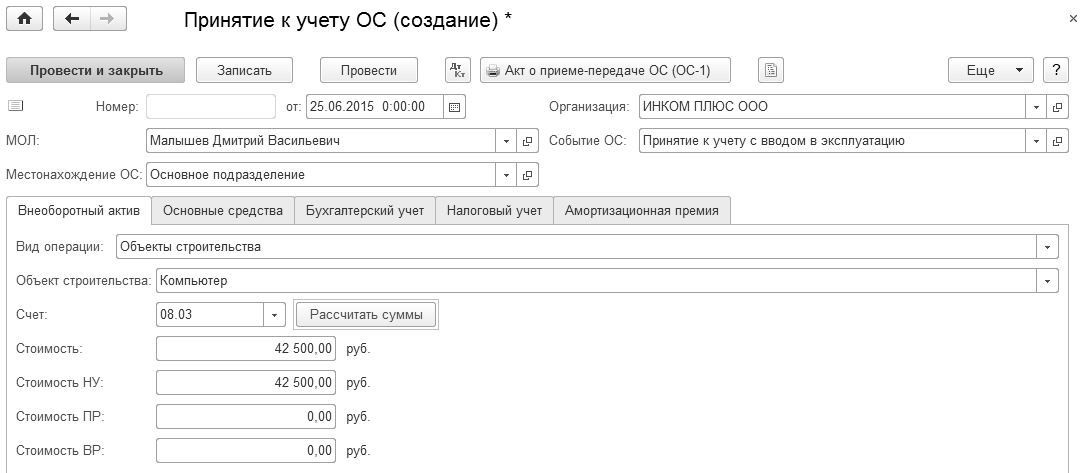 В шапке документа следует выбрать МОЛ – Малышев Д.В, местонахождение ОС – "Основное подразделение". Вид операции "Объекты строительства". Нажать кнопку командной панели документа "Рассчитать суммы".
