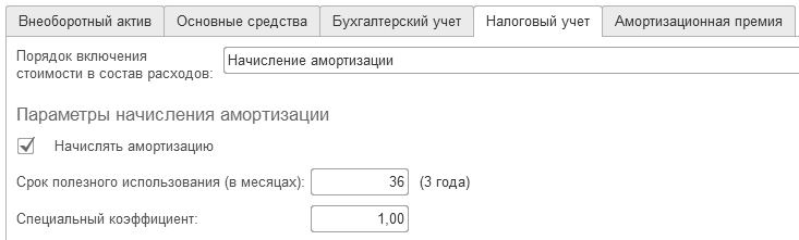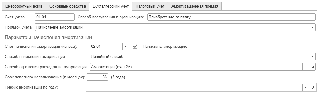 На закладках "Основные средства", "Бухгалтерский учет" и "Налоговый учет" следует для основного средства "Компьютер" заполнить реквизиты: ОКОФ – 14 3020201, амортизационная группа – вторая, группа учета ОС – офисное оборудование. Компьютер будет находиться в основном подразделении, и числиться за материально-ответственным лицом Малышевым Д. В. Порядок учета – начисление амортизации. Способ поступления – приобретено за плату. Способ начисления амортизации – линейный, способ отражения расходов по амортизации – счет 26 "Общехозяйственные расходы", срок полезного использования – 36 месяцев. Амортизационную премию не применяем.