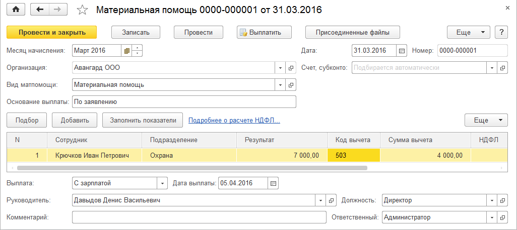 Сотруднику ООО "Авангард" Крючкову И.П. в марте выдали материальную помощь на сумму 7000 руб. Из раздела "Зарплата/ Все начисления" создадим документ "Материальная помощь" и заполним его следующими условиями (обратите внимание, что вычет должен рассчитаться автоматически):