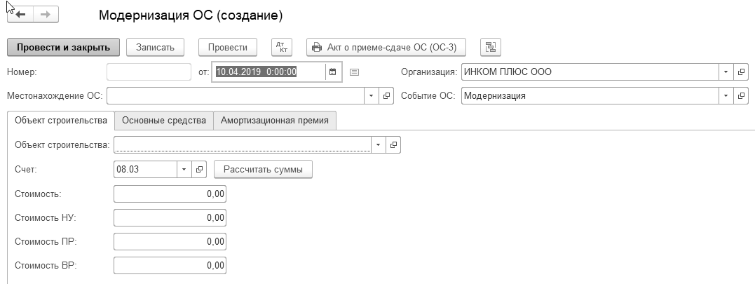 Обратиться к документу "Модернизация ОС" можно при помощи меню "Панель разделов/ОС и НМА/Панель навигации/Учет основных средств/Модернизация ОС". Этот документ состоит из шапки документа, закладок "Объект строительства", "Основные средства" и "Амортизационная премия". Заполнение документа следует начинать с шапки документа, с последующим переходом на закладку "Объекты строительства", где обязательно следует нажать кнопку "Рассчитать суммы". В результате, суммы модернизации заполнятся автоматически по данным учета на момент формирования документа. При необходимости эти суммы можно откорректировать вручную.