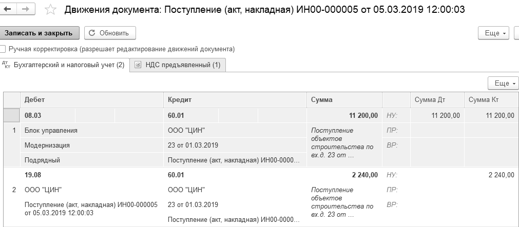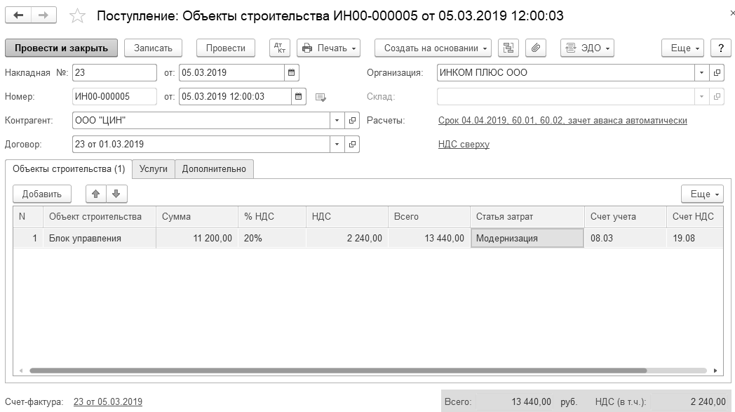05.03.2019 года ООО "ЦИН" представил накладную № 23 и счет-фактуру № 23 за блок управления. Цена блока управления 11 200 руб. (НДС 20% сверху). Заключен договор №23 от 01.03.2019 года. Сумма накладной 13 440 руб., в т. ч. НДС.