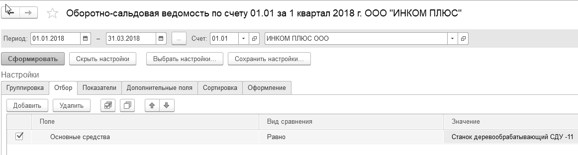Воспользуйтесь панелью настройки, на закладке "Отбор" укажите основное средство "Станок деревообрабатывающий" (рис. 10.6.6).