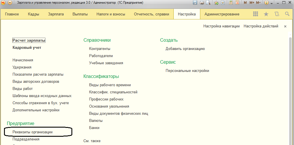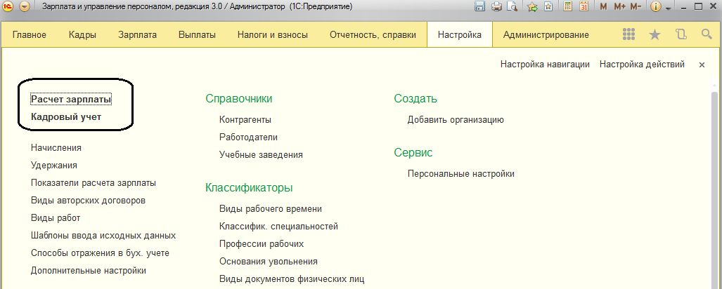 Поскольку программа рассчитана на ведение учета на предприятиях различного масштаба, в ней реализован широкий спектр различных возможностей. При начале работы с программой пользователь может настроить ее для своего предприятия таким образом, чтобы убрать лишние возможности и не загромождать программу невостребованным на текущий момент функционалом, либо напротив, использовать все предусмотренные возможности без исключения (тогда в пунктах меню появятся дополнительные команды, будет открыт доступ к дополнительным документам и справочникам, будут добавлены новые начисления и т.п.). В последующем при необходимости можно будет изменить данные настройки.