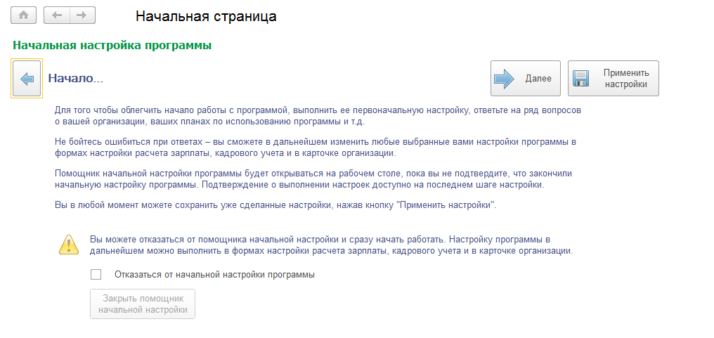Обеспечивается отключение стартового помощника (его дальнейшего автоматического появления при последующих запусках программы) и переход непосредственно к работе с программой.