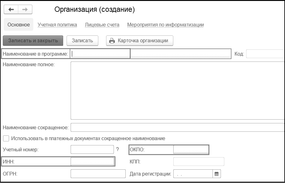 После первого запуска программы необходимо ввести минимальные сведения об учреждении, ведущем учет в программе. Достаточно заполнить обязательные поля, подчеркнутые красным – Наименование, ИНН, код ОКПО.