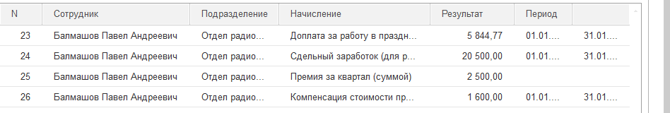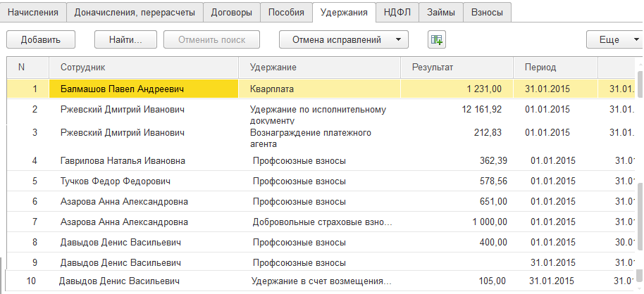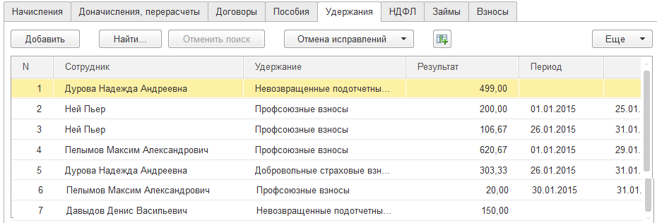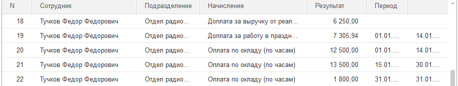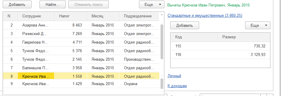 Также вычеты есть у Крючкова И.П. Следует обратить внимание, что у него менялось место работы (подразделение) – вычеты распределены пропорционально. Также два места работы у Тучкова Ф.Ф.(основное и по внутреннему совместительству).