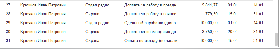 Крючков И.П., работал рабочим в отделе радиооборудования со сдельной оплатой до 15.01. (размер сдельной оплаты введен при приеме на работу, выработка – документом «Данные для расчета зарплаты»). Доплата за работу в праздники сформирована, т.к. графиком Сменный 2/2 А введено значение времени работы в праздники. После сотрудник был переведен охранником на оклад по часам (назначен при переводе) и график Сменный 24ч. Доплата за работу ночью сформирована, т.к. графиком Сменный 24ч. введено время работы ночью. Доплата за совмещение назначена отдельным приказом.