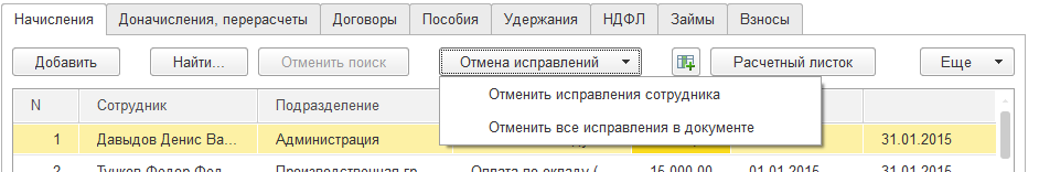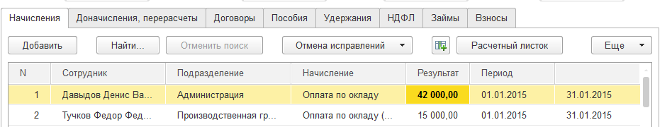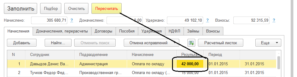 Исправленные строки отмечаются жирным шрифтом, при этом взаимосвязанные начисления автоматически пересчитываются.