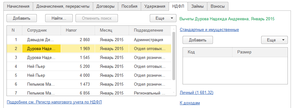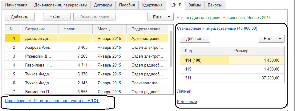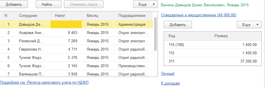Анализ рассчитанных сумм по НДФЛ можно производить в самом документе, используя переход к данным по вычетам и регистру налогового учета по НДФЛ.