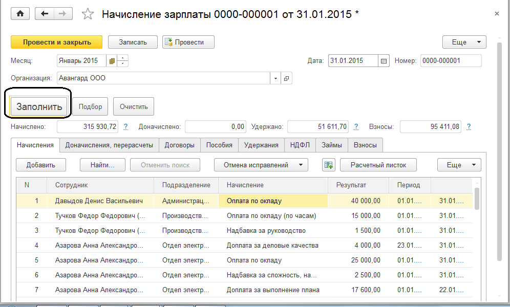 Из раздела «Зарплата/ Начисления зарплаты» создадим документ «Начисление зарплаты» для расчета сумм сотрудникам ООО «Авангард» за январь 2015г. Создадим документ, укажем месяц начисления – январь 2015, по команде «Заполнить» заполним и рассчитаем суммы сотрудникам.