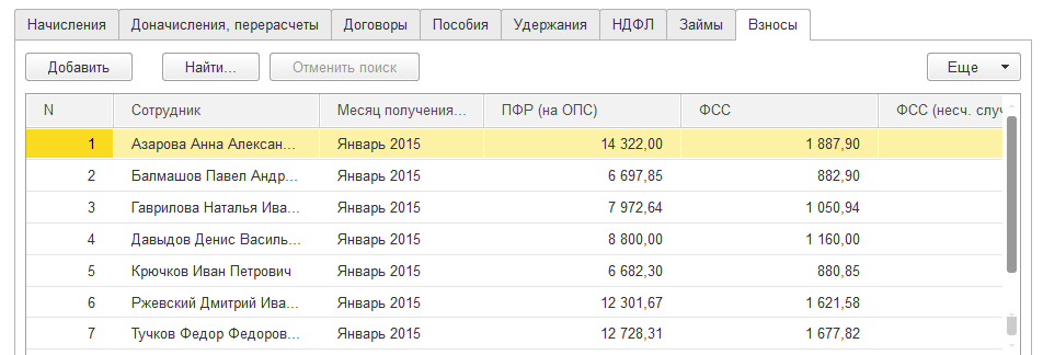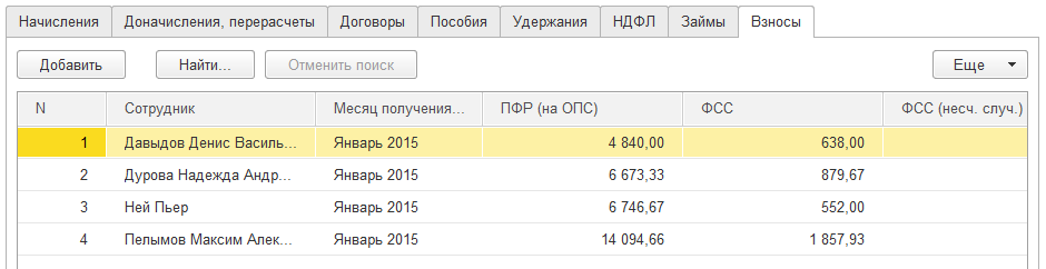 База по взносам собирается за месяц по всем отдельным документам (таким как премии, больничные и т.п.), и при окончательном расчете учитывает данные текущего документа по заработной плате. Расчет взносов производится автоматически.