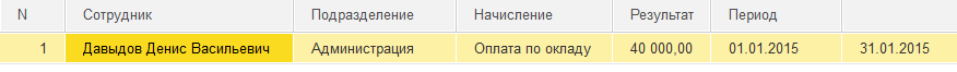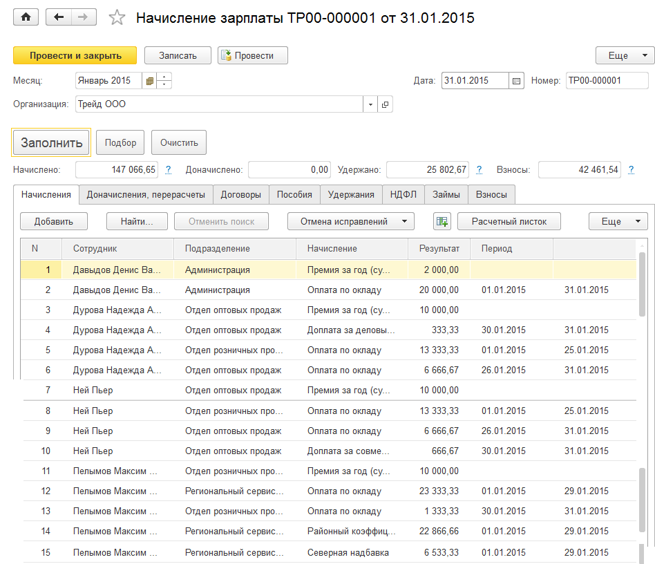 Необходимо начислить зарплату сотрудникам ООО «Трейд» за январь 2015г. Рассчитаем и проведем документ «Начисление зарплаты».