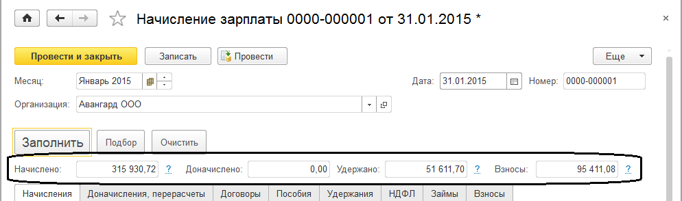 В нашей учебной базе за январь не вводились отдельные документы по расчету сумм сотрудникам ООО «Авангард», следовательно, взносы рассчитаны только по данным текущего документа.