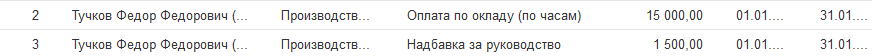 Тучков Ф.Ф., оплата по окладу по часам назначена при приеме на работу (несколько строк – из-за изменений в течение месяца в связи с изменениями документом «Изменение плановых начислений), график работы Сменный 2/2 А в конец месяца был изменен на Сменный 2/2 Б. Доплата за работу в праздники сформирована, т.к.графиком введено значение времени работы в праздники. Доплата за выручку сформирована, т.к. ведено значение определяющего ее показателя документом «Данные для расчета зарплаты».