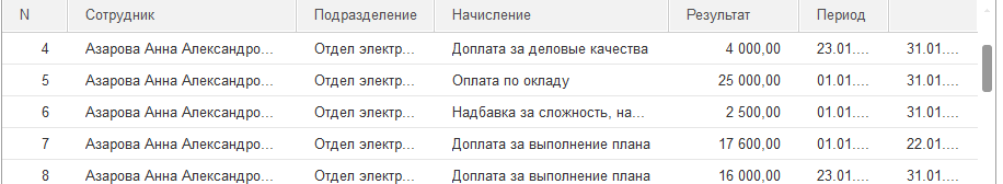 Азарова А.А., оплата по окладу и надбавка за сложность задана при приеме на работу, доплата за деловые качества введена отдельным документом (Изменение оплаты труда), доплата за выполнение плана сформирована, т.к. ведено значение определяющего ее показателя документом «Данные для расчета зарплаты». График – Пятидневка.
