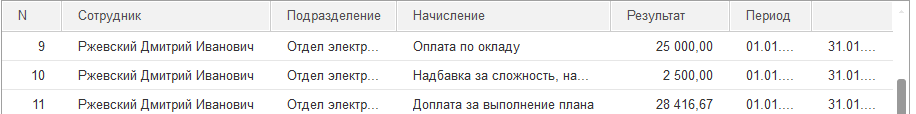 Ржевский Д.И. оплата по окладу и надбавка за сложность задана при приеме на работу, доплата за выполнение плана сформирована, т.к. ведено значение определяющего ее показателя документом «Данные для расчета зарплаты». График – Пятидневка.