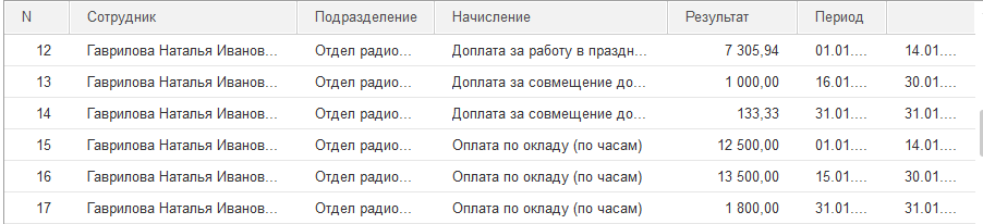 Гаврилова Н.И., оплата по окладу по часам назначена при приеме на работу (несколько строк – из-за изменений в течение месяца в связи с изменениями документом «Изменение плановых начислений), график работы Сменный 2/2 А в конец месяца был изменен на Сменный 2/2 Б. Доплата за работу в праздники сформирована, т.к.графиком введено значение времени работы в праздники. Доплата за совмещение назначена отдельным приказом.
