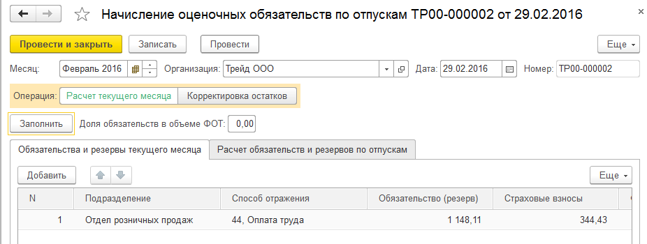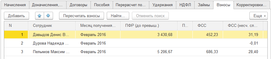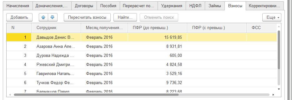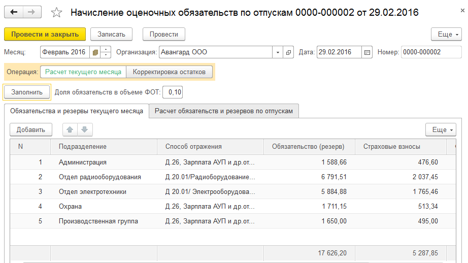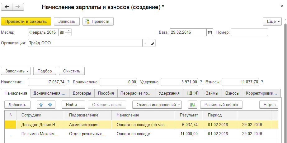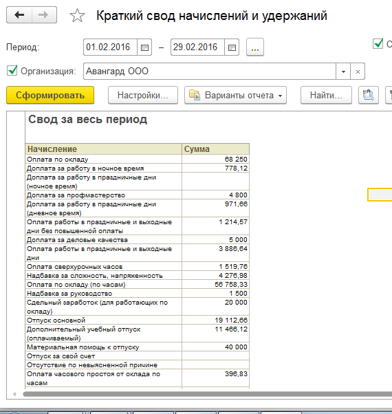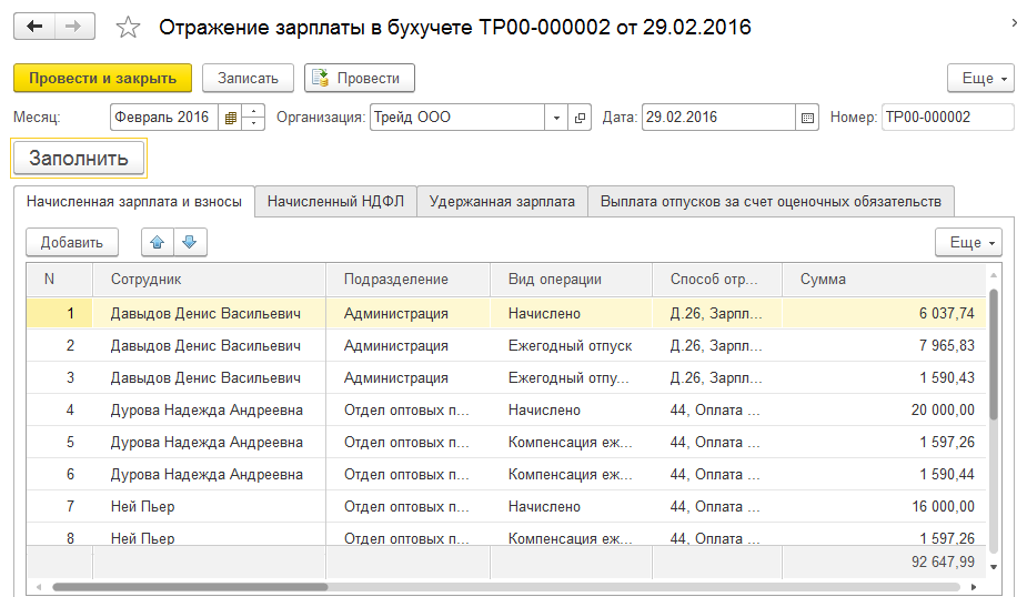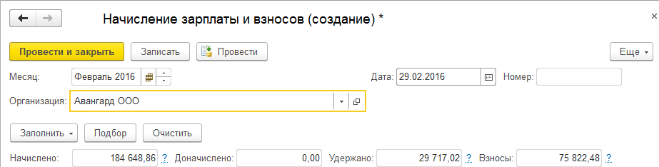 Обратите внимание, что суммы отпускных, среднего заработка и т.п. в документ "Начисление зарплаты и взносов" попадать не будут – они рассчитаны и записаны в регистры расчета по отдельным документам. Увидеть общий итог зарплаты за месяц можно в отчетах: расчетный лист, свод и т.п.