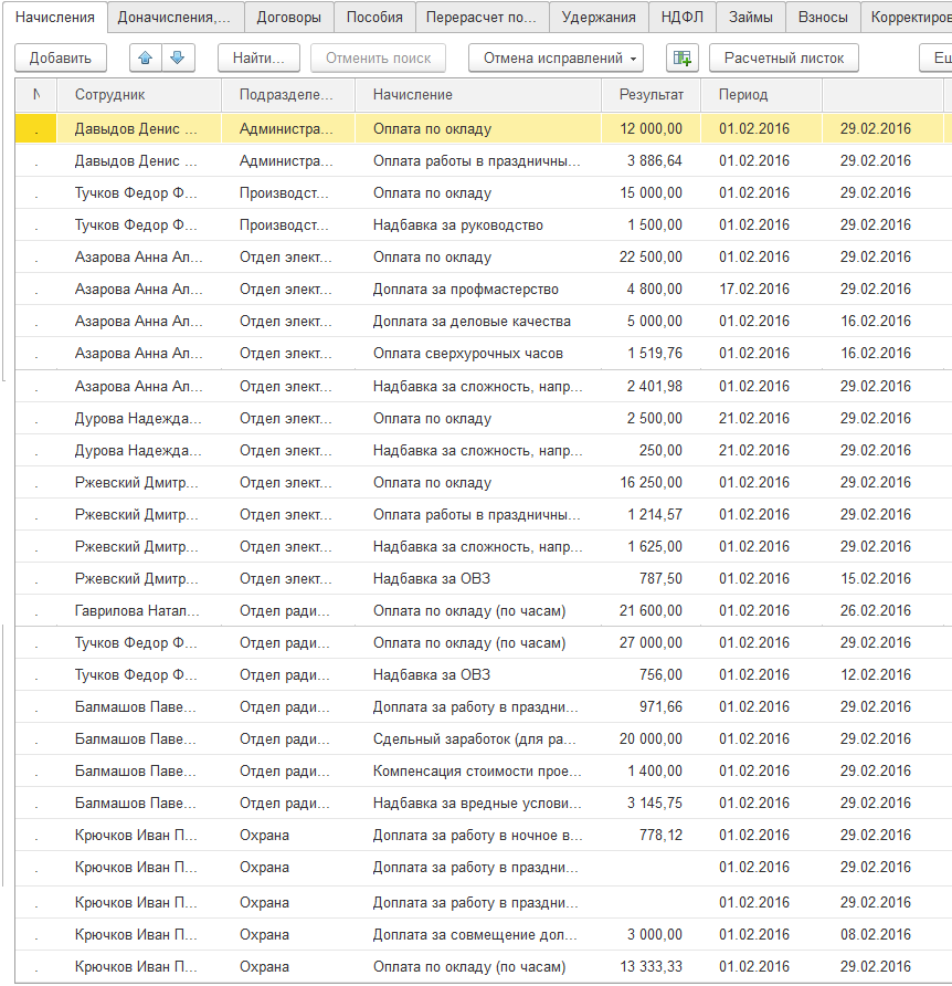 Напомним, что перед расчетом зарплаты может потребоваться ввод данных для расчета зарплаты. В данном месяце никаких сведений о сдельной оплате, выручке и прочих показателях не поступало. Аванс в рамках курса также не выплачивался, т.к. мы ввели достаточно много отсутствий в течение месяца. Произведем расчет зарплаты и проанализируем полученный результат.