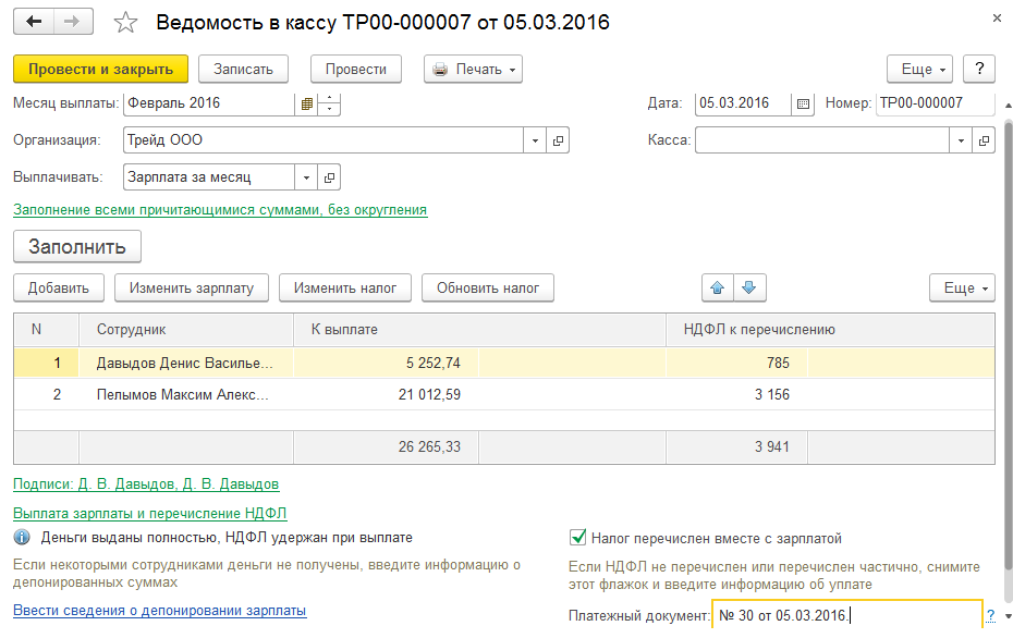 Для ООО "Трейд" через кассу. Реквизиты уплаты НДФЛ: № 30 от 05.03.2016.