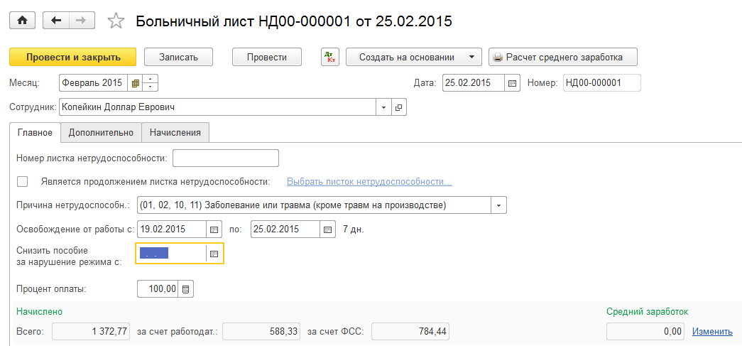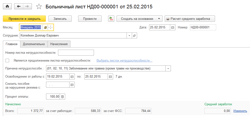 25.02 зарегистрировать документ Больничный лист для сотрудника Копейкина.
