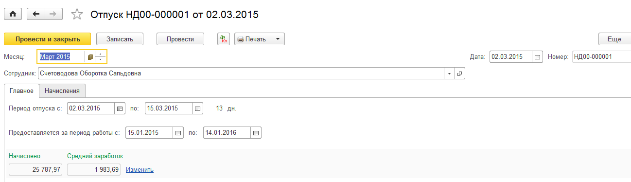 В документе «Отпуск» необходимо заполнить период отпуска и рабочий год, средний заработок и сумма к начислению рассчитывается автоматически.