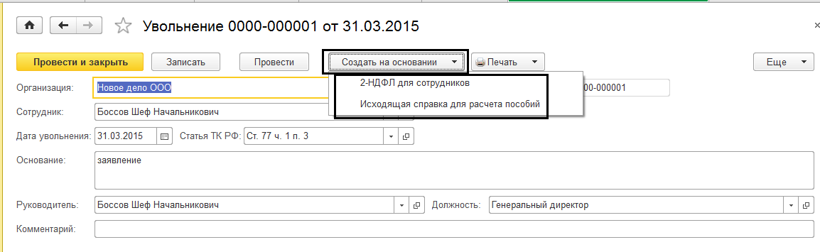 Уволить генерального директора 31 марта. На основании документа создать необходимые справки.
