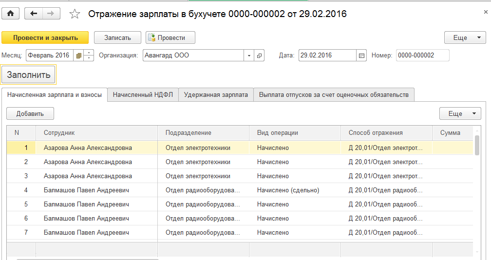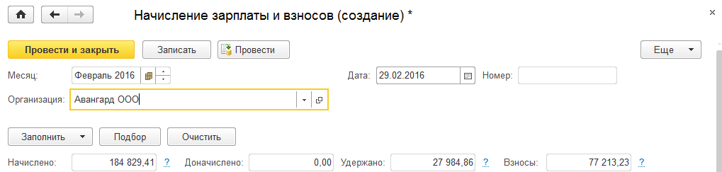 1. Сформируем отражение зарплаты в учете за февраль для ООО "Авангард".