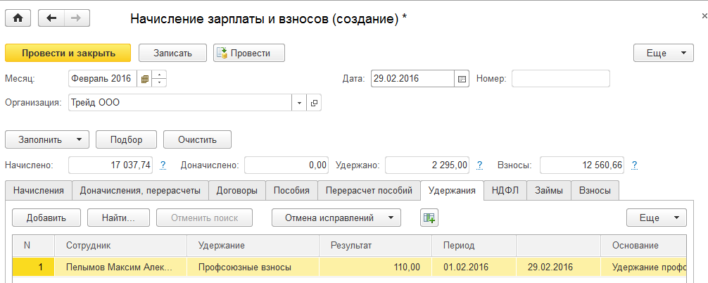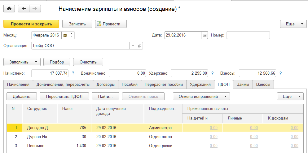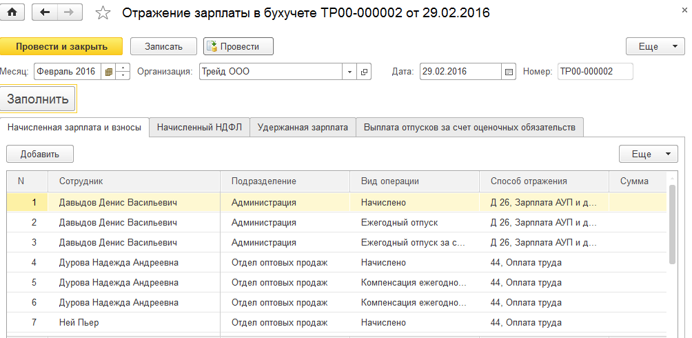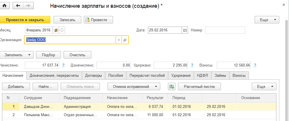 2. Начислим зарплату за февраль сотрудникам ООО "Трейд".
